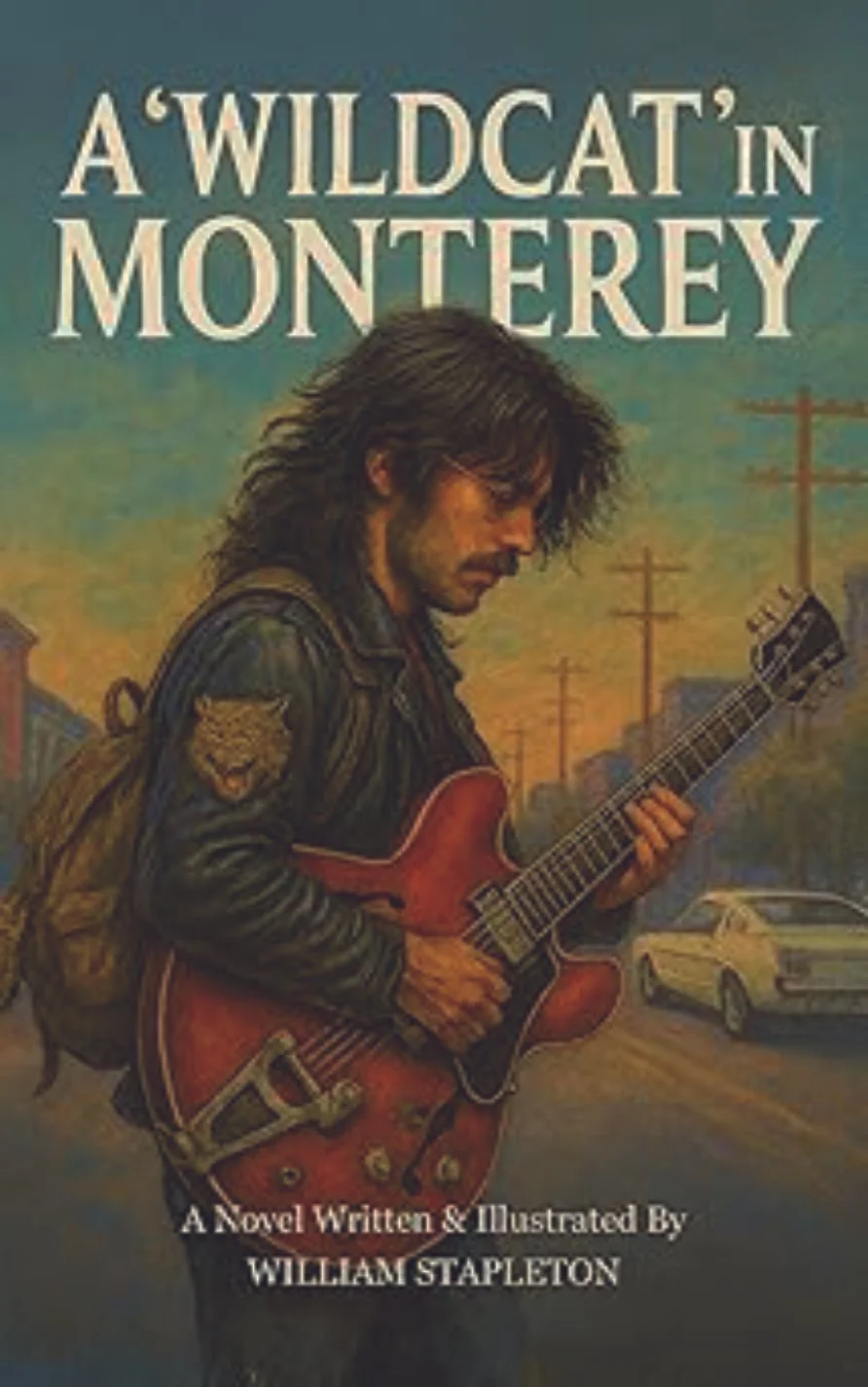 Award Winning Pacific Northwest guitarist and pillar of the Puget sound music community William ‘Billy’ Stapleton reveals his hidden talent as an author and illustrator in his first novel “A Wildcat in Monterey,” a self-published work released in February of 2026. Stapleton has been hard at work on the book for over 15 years but those who know him personally are well aware of his gift as a compelling storyteller. The narrative set primarily in the pivotal year of 1977 is the first person account of fictional guitarist Johnny Lyons and his life and times spent in Monterey on the California coast and how he got swept up in the world of organized crime and 70’s drug culture. After Lyon’s music career is sidelined by an injury, he unwittingly becomes an addict whose life has to hit absolute rock bottom before some precious friends and family, some dumb luck, and an uncanny sense of self preservation dig him out of an early grave. Musicians will especially enjoy the tale told in Lyon’s voice in colorful jargon and street-smart “music speak,” diving deep into topics of vintage gear, 70’s music, style and California culture. The story evolves into a suspenseful page tuner as Lyon’s very life comes into jeopardy so that he has to hatch an elaborate plan to save himself from both sides of the law, revealing the mindset of someone struggling with addiction and an array of personal demons seeking to redeem himself and prove his critics wrong and his supporters right, ultimately clearing his life debt. Rick J Bowen